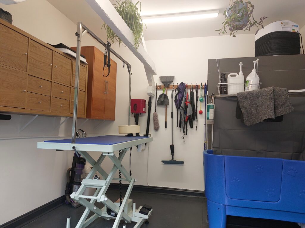 The salon is fairly small, perfectly sized for one dog or cat and one groomer. I do not have crates, kennels or any kind of holding area, so I operate on a “one in, one out” basis. I can accommodate up to three dogs from the same household simultaneously, as long as they are happy to relax in the room – with a bed provided – while their family members are being groomed.
